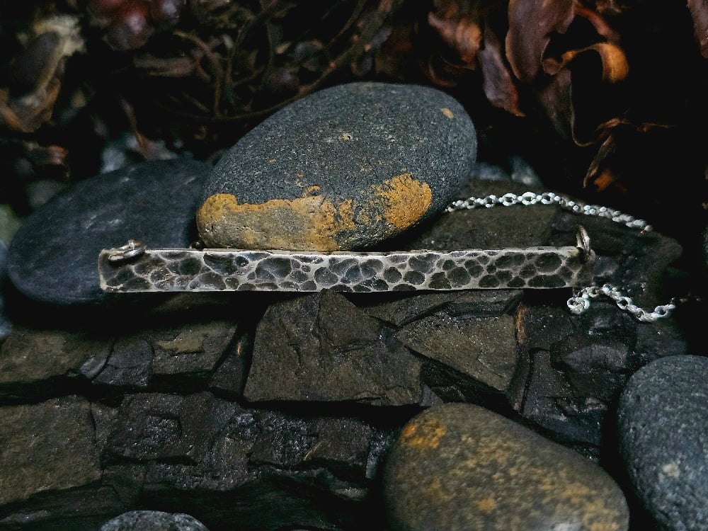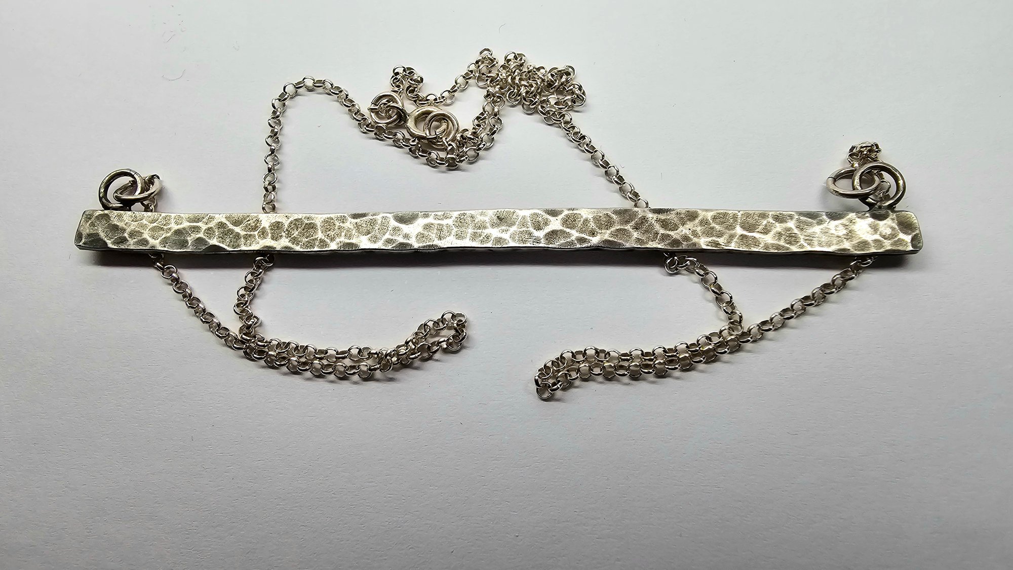 This bar necklace design is inspired by a life long love of being in and underwater and a fascination at the way light reflacts on waters surface and how it moves and plays on the sea floor.
