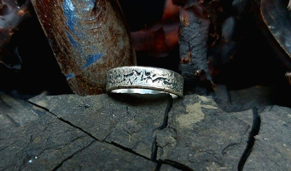 Using a technique I developed I created this piece with the sound of softly moving water in mind. Notice the details, highlighted with patina, that wraps all the way around the top and bottom of the ring to really maximise the flowing, liquid texture.